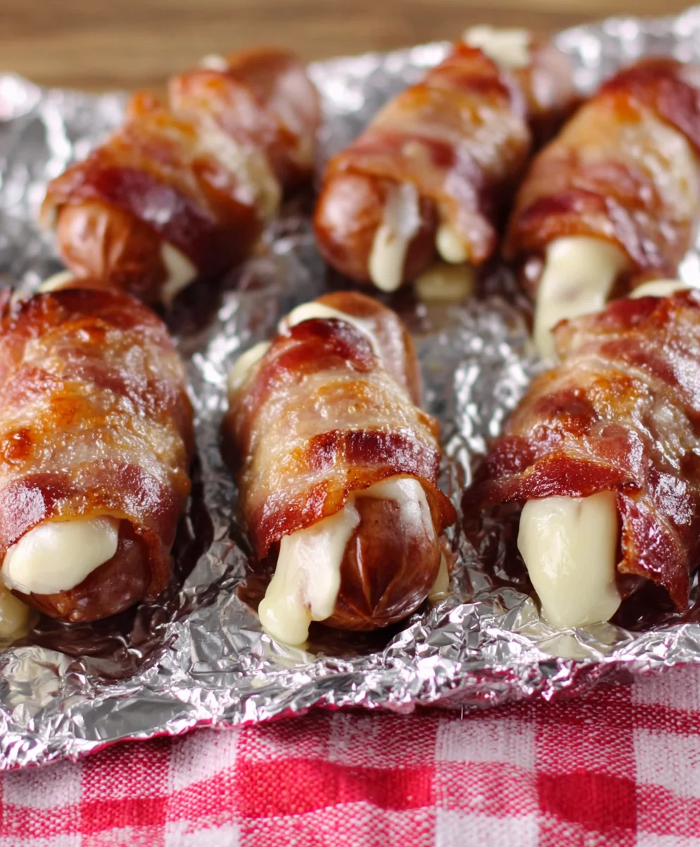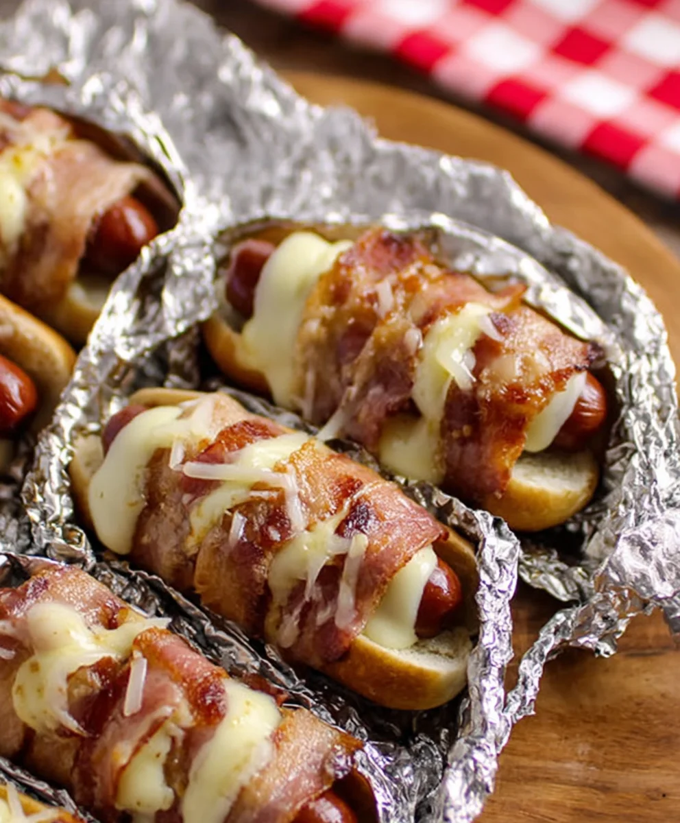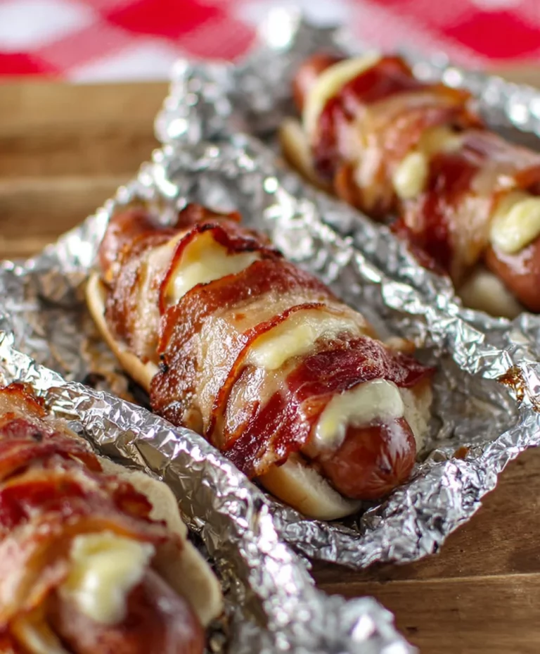 Campfire Method (Foil-Wrap): Set each wrapped hot dog on its own square of foil and wrap snugly, sealing edges. Place on the grate over steady heat. Cook 10–15 minutes, turning occasionally, until the hot dogs heat through, the cheese melts, and the bacon crisps.