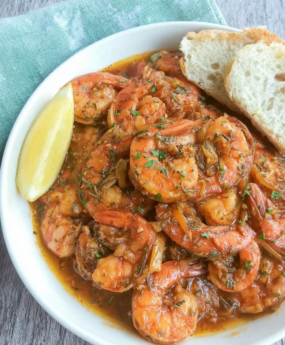 Serve immediately: Transfer the shrimp with sauce to a serving platter. Provide lots of crusty bread to soak up the sauce, lots of napkins and finger-bowls if you like. Garnish each serving with a wedge of lemon.