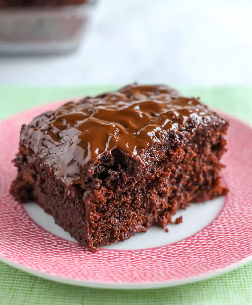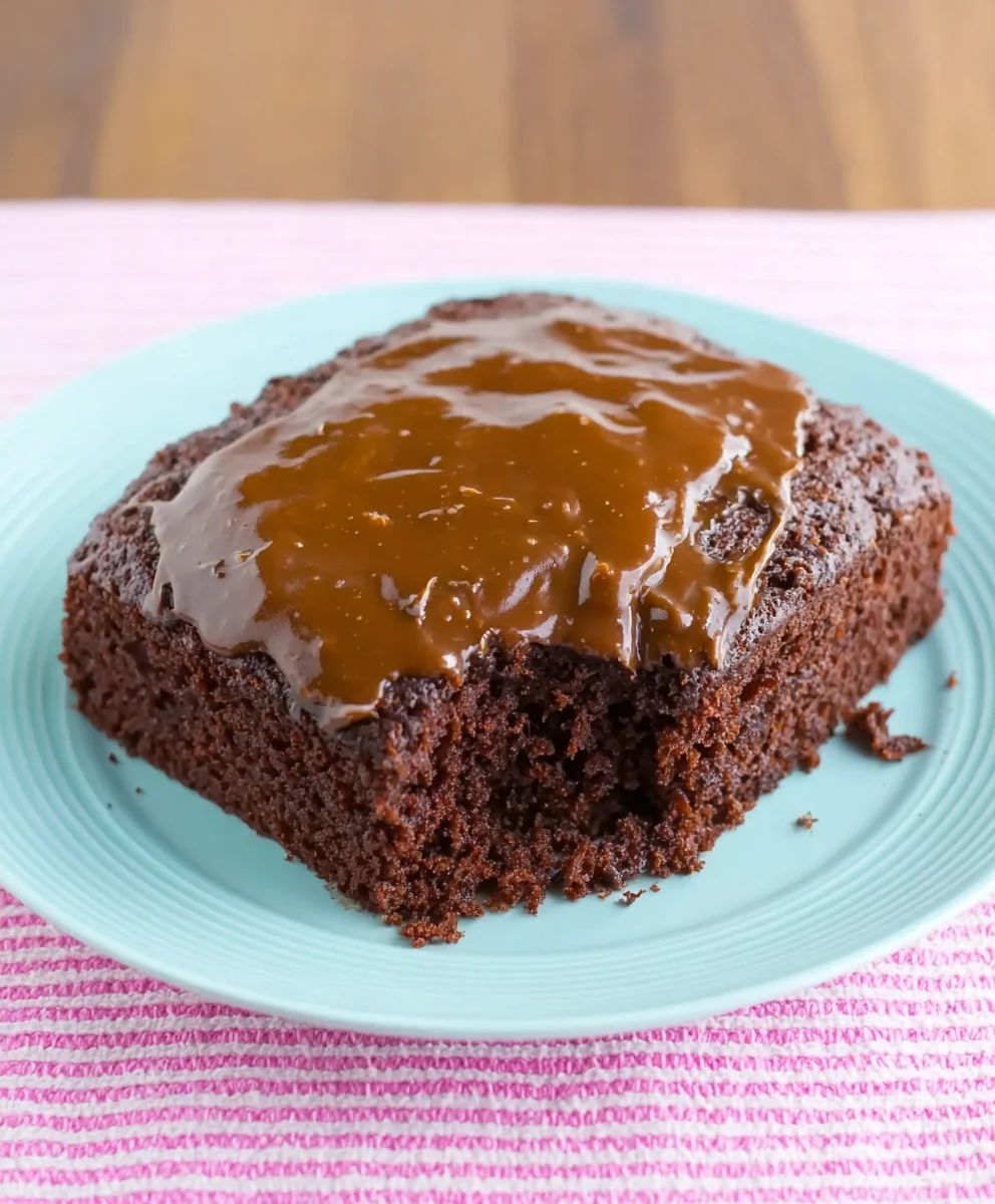 - Pour frosting while cake is warm, so it seeps in nicely and forms a glossy top.