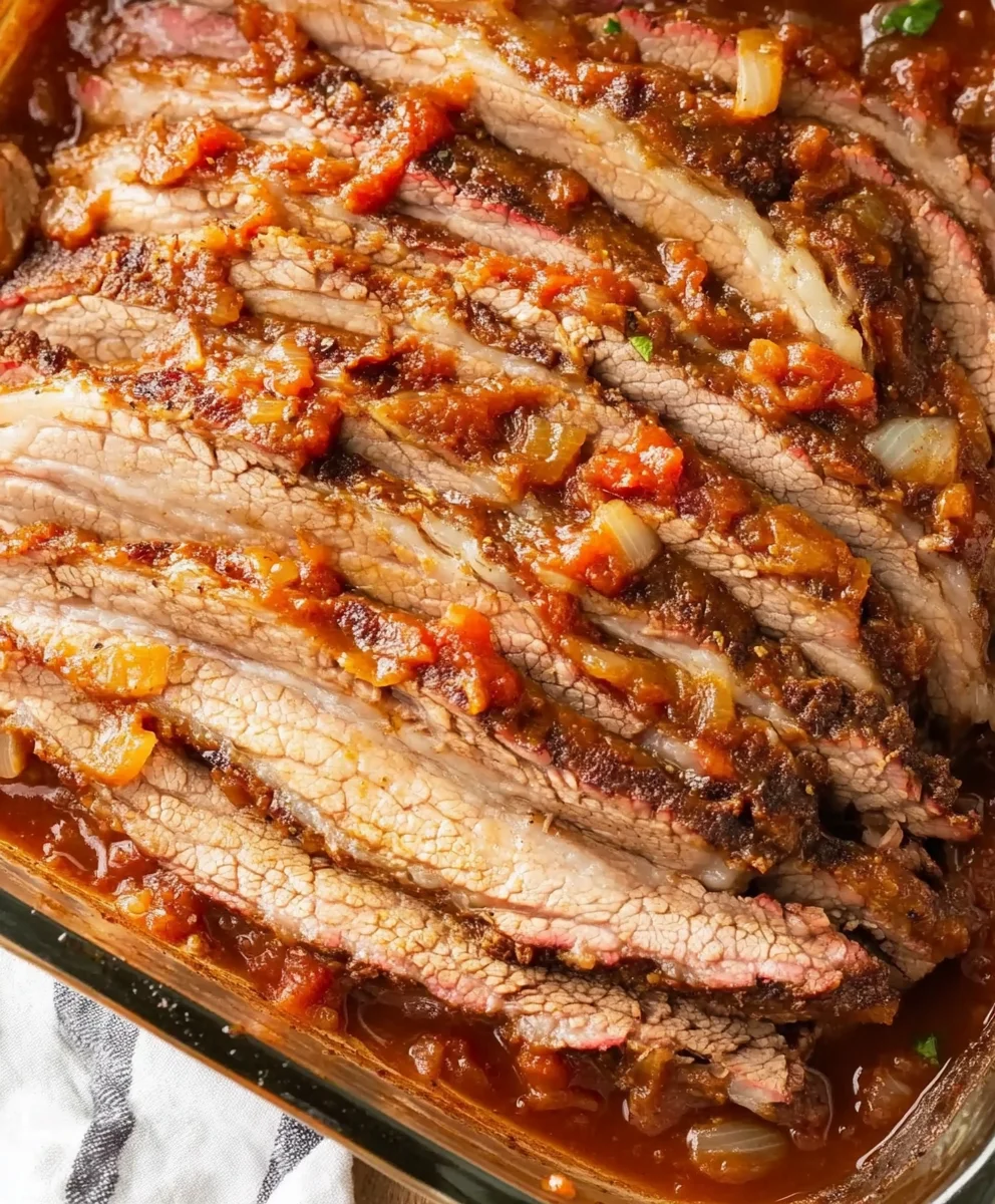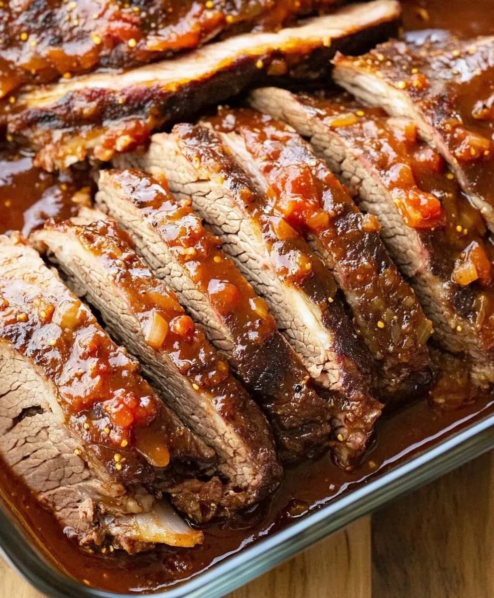 Rest and Slice: Let the brisket cool slightly before slicing. Return the slices to the dish, spoon sauce over, and reheat briefly if needed.