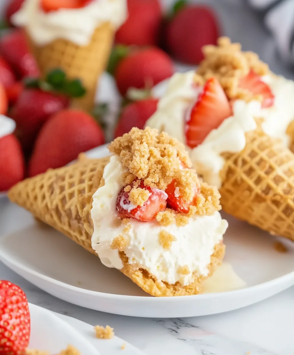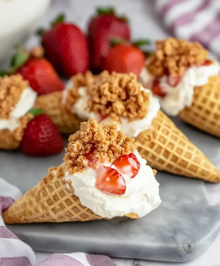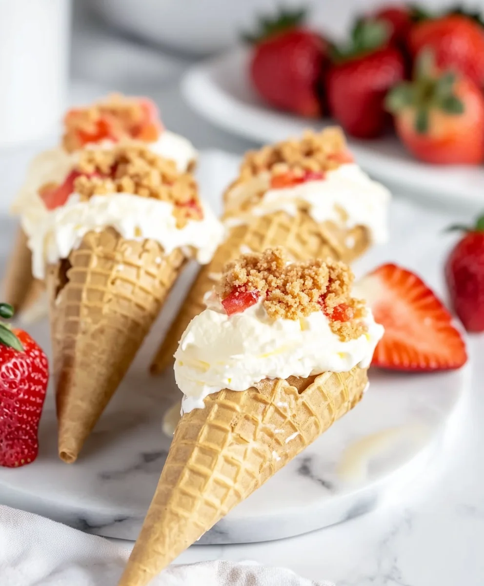 Savor the Sweet Crunch of Strawberry Crunch Cheesecake Cones